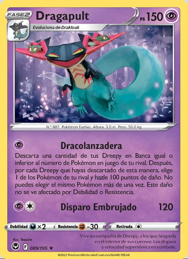 Descarta una cantidad de tus Dreepy en Banca igual o inferior al número de Pokémon en juego de tu rival. Después, por cada Dreepy que hayas descartado de esta manera, elige 1 de los Pokémon de tu rival y hazle 100 puntos de daño. No puedes elegir el mismo Pokémon más de una vez. Este daño no se ve afectado por Debilidad o Resistencia.