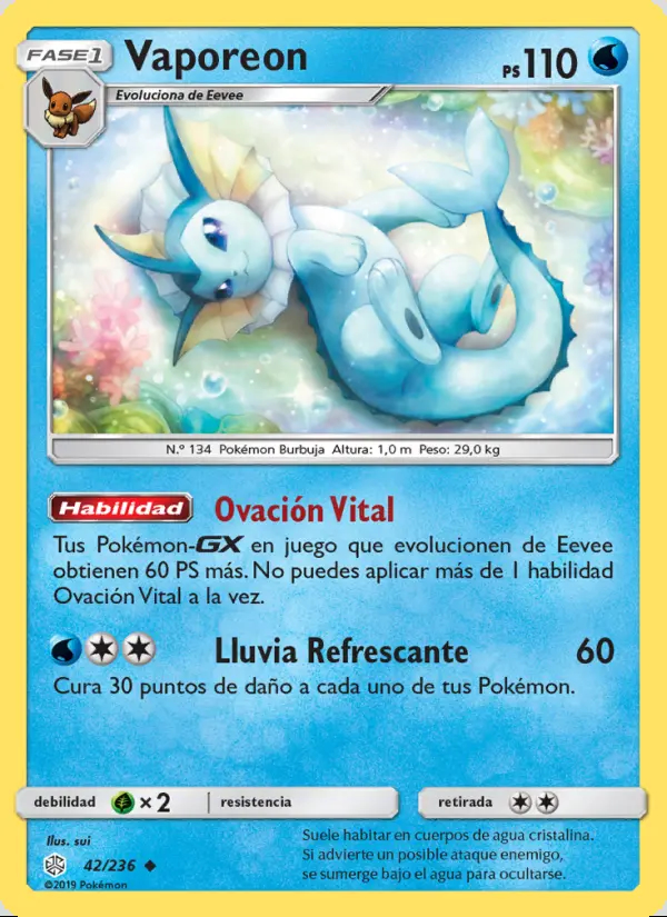 Habilidad: Tus Pokémon-GX en juego que evolucionen de Eevee obtienen 60 PS más. No puedes aplicar más de 1 habilidad Ovación Vital a la vez.